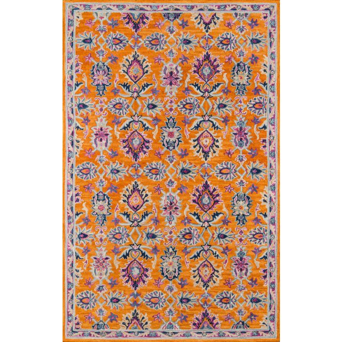 The saturated shades of this decorative area rug reinvent the classic Persian carpet in a vivid color palette. The captivating assortment offers a modern interpretation of traditional rug motifs, as vibrant pink, orange, blue and yellow tones form flowers, vines, palmettes and medallions in colors beautiful and bold. Hand tufted from 100% natural wool, each floorcovering makes a dramatic design statement as a focal point on floors throughout the home.