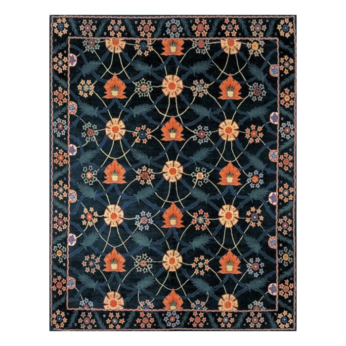 he quintissential design - classic ideals made contemporary. An Arts and Crafts inspired piece for the modern age. The deep navy Tibetan wool background is framed by an ebony border and highlighted by an array of rich and vibrant accent colors in Tibetan wool, including hues of gold, raspberry, red, teal, maroon, Wedgewood blue, ivory, yellow, ebony and indigo. This piece has been crafted by hand in our true 100 knot quality.