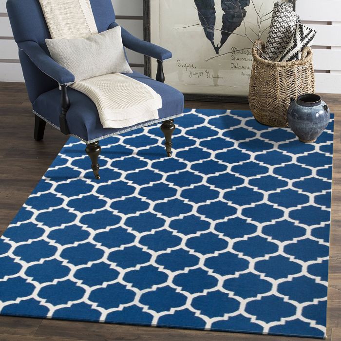 Description / Rugsville Moroccan Tile Frontier Blue Wool Handwoven Dhurrie Carpet 5' x 8'