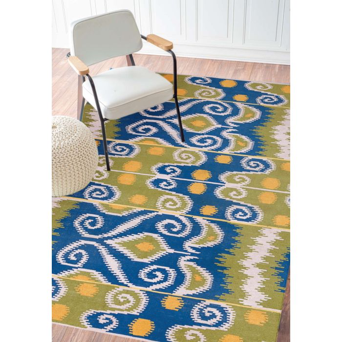 Rugsville Ikat flat weave rug are hand woven in India using vegetable dyes, Bamboo silk & using the ancient dyeing technique of Ikat.