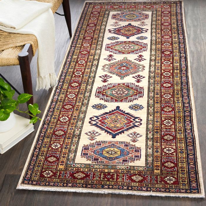 This rug is a unique piece of world art that will enhance your living space. Kazak Rugs are made from 100 percent wool. The height of the pile is 0.25 inches. The handcrafted touch of artisan skill produces variations in color, shape, and design.