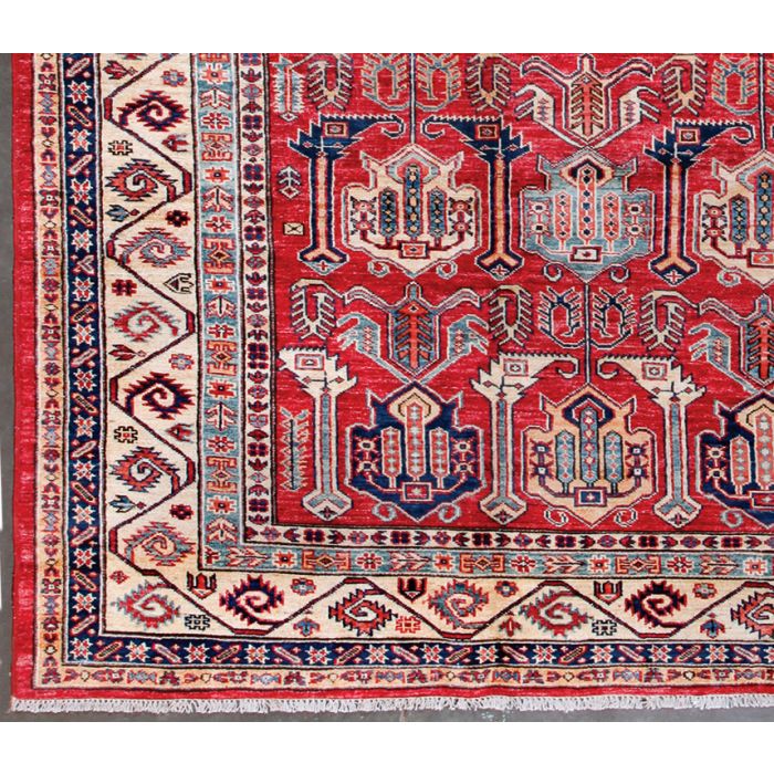Rugsville Kazak rug is a unique piece of world art that will enhance your living space. Kazaks are a type of Armenian rug that were woven in the south of the Caucasus region, between Tiflis and Erevan. The production of rugs in the Caucasus region is limited, only done in a few villages, therefore these beautiful designs are being reproduced by Afghan weavers in the northern (Turkoman tribes) and central (Hazara tribes) parts of Afghanistan. This rug is made with 100-percent wool and vegetable dyes. The pile height is 0.25 inches.
