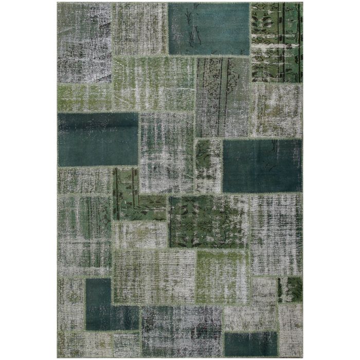 Vintage style overdyed Green wool area rug collection brings popular Green patchwork looks to a Hand Knotted construction from Turkey, making the stylish designs durable and affordable. The colors vary throughout the rug due to the original wear and pattern of the segments. Each rug is a unique creation of colors and unique sizes.